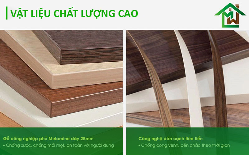 Bàn họp được thiết kế từ vật liệu chất lượng cao với gỗ công nghiệp phủ Melamine chống xước, chống mối mọt và an toàn cho người dùng.