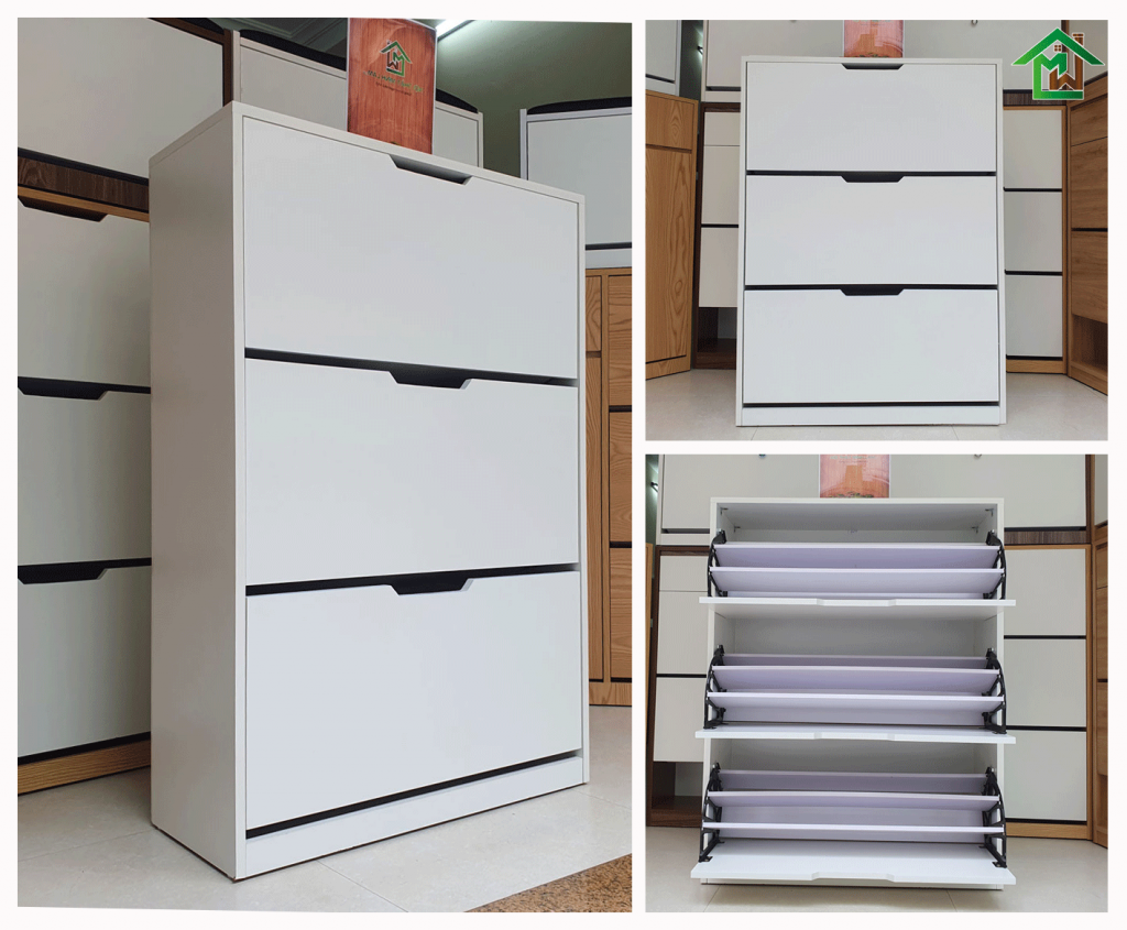 – Cánh mở lật thông minh, mỗi cánh chia làm 3 khoang để giày. Sức chứa gấp đôi tủ giầy thông thường cùng kích thước.