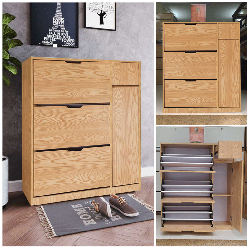 – Cánh mở lật thông minh, mỗi cánh chia làm 3 khoang để giày. Sức chứa gấp đôi tủ giầy thông thường cùng kích thước.